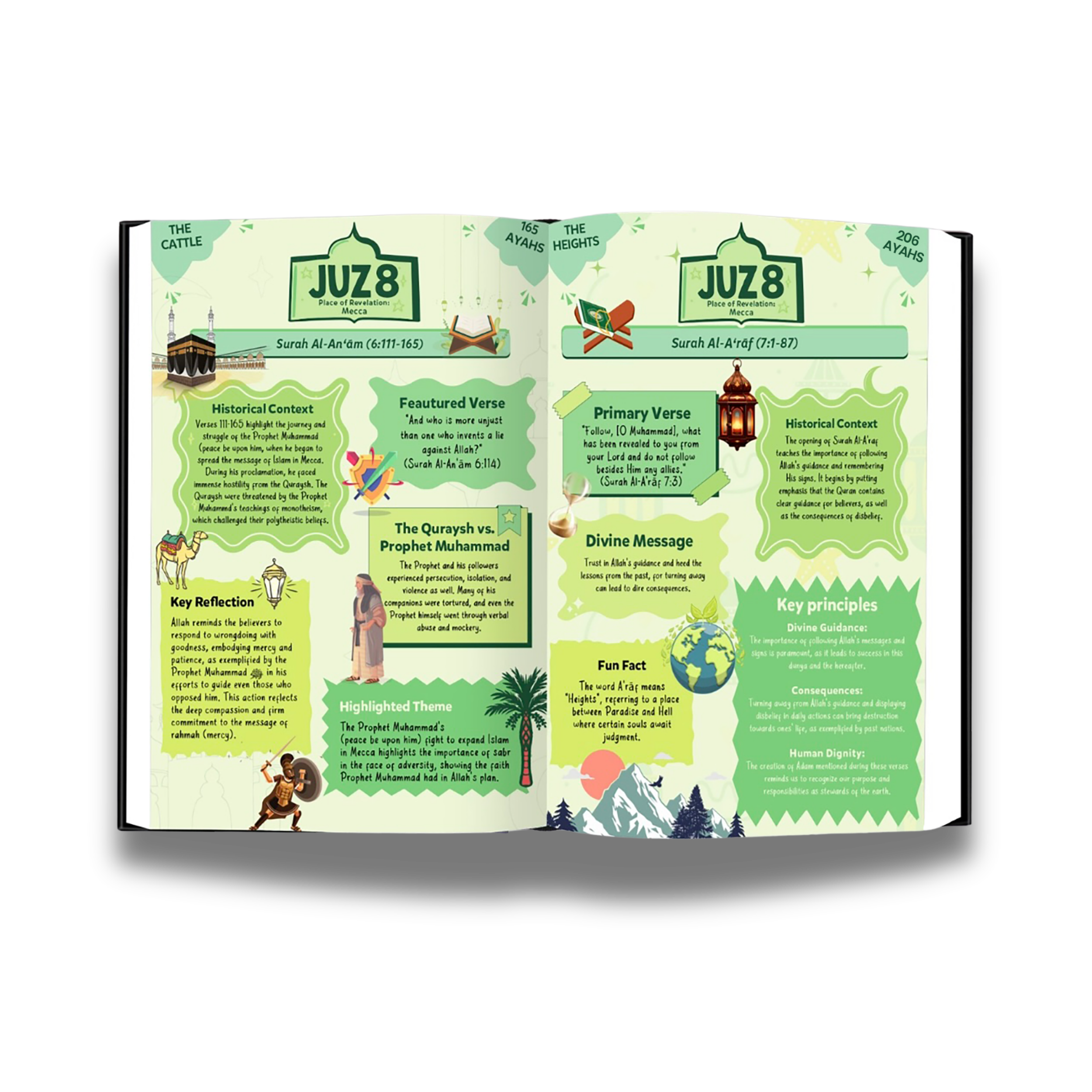 Deen Stories is arranged with reverence to follow the sequence of the Qur’an, guiding readers through all 114 Surahs across the 30 Juz. Each page is centered on a core verse and its own reflection. Thoughtfully designed illustrations and icons bring the themes of each surah to life, while 70 carefully crafted pages include meaningful dua’s and moments of dhikr with clear explanations, making it a book to return to throughout Ramadan and beyond.